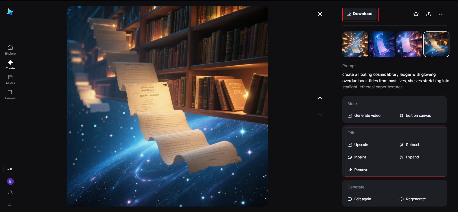 When your artwork appears, explore Dreamina’s advanced customization tools. Use inpaint to add missing stars, expand to widen the library shelves, remove any stray ink blots, or retouch ethereal lighting. Once you’re delighted with the final version, click the “Download” icon and save your overdue masterpiece for printing or digital sharing.